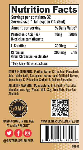 Key Ingredients Per Serving: L-Carnitine (3000 mg), Chromium (200 mcg from Chromium Picolinate), and Pantothenic Acid (Vitamin B5) (10 mg).