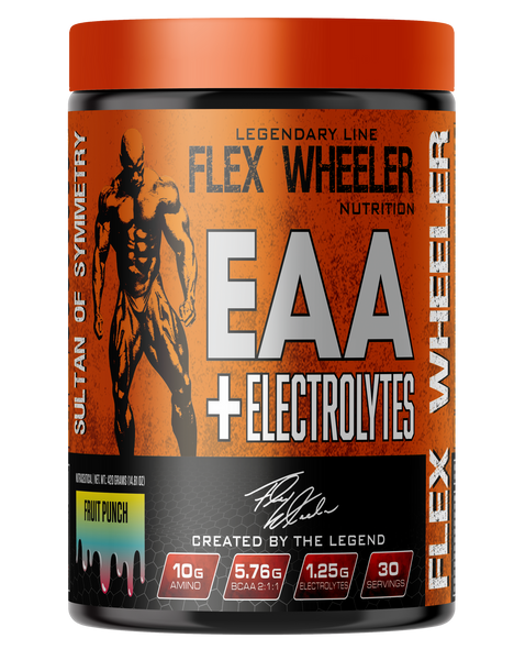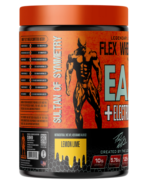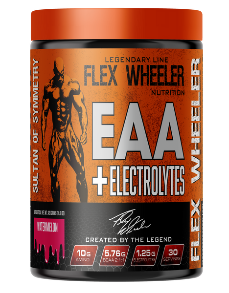 Flex Wheeler EAA + Electrolytes is a premium supplement designed to support your body's needs during and after intense workouts. This product, part of the legendary bodybuilder Flex Wheeler's signature line, is crafted for those who prioritize both muscle recovery and hydration. Unlike simple BCAAs, this formula provides a full spectrum of all nine Essential Amino Acids (EAAs), including the three Branched-Chain Amino Acids (BCAAs: Leucine, Isoleucine, and Valine) in a potent 7.5g dose per serving.