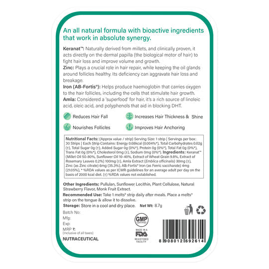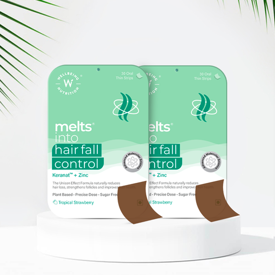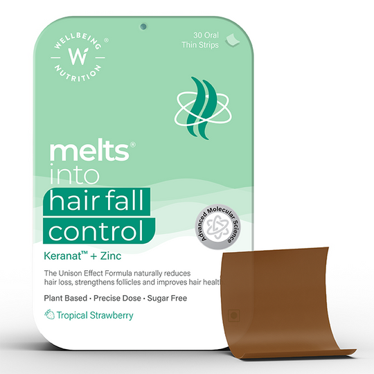 Wellbeing Nutrition Hair Fall Control is a dietary supplement designed to combat hair loss and promote healthier hair growth from within. Similar to other products in their "melts" line, it comes in the form of a fast-dissolving oral thin strip. This innovative delivery system is based on advanced nano-technology, which allows for rapid absorption of key nutrients directly into the bloodstream, bypassing the digestive system for maximum efficacy.
