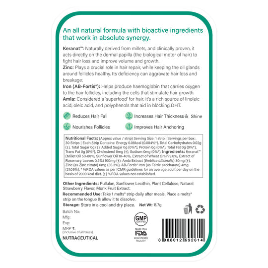 Keranat™: A patented ingredient derived from millet, clinically studied to reduce hair fall, improve hair anchoring, and promote cell multiplication in the hair bulb.