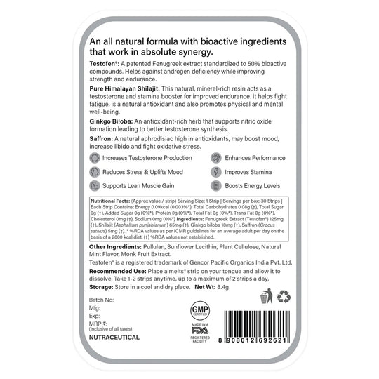 The formula is a powerful blend of clinically-backed, potent herbal extracts and minerals. Testofen®, a patented Fenugreek extract, is a key ingredient proven to naturally support testosterone levels and help reduce the symptoms of andropause. Shilajit, a mineral-rich resin, works to enhance endurance, fight fatigue, and further support testosterone levels. Ginkgo Biloba is included to boost nitric oxide (NO) production, which supports blood flow and can lead to improved muscle oxygenation and athletic performance. Saffron and other potential ingredients like Cordyceps Militaris contribute to improved mood, energy, and overall vitality.