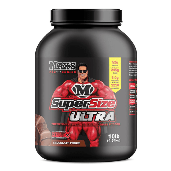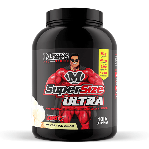 when you want to get really big, really fast – MAX’S SuperSize ULTRA is the product for you! You will pack thousands more calories of muscle-building nutrients into your daily eating plan to ensure you make the gains you want. Choose your serving size to match your goals, from moderate increases in size and strength to rapid massive gains, it’s up to you. Supersize comes in two delicious flavors (Vanilla and Chocolate) so you will look forward to every shake - and it's also awesome value.
