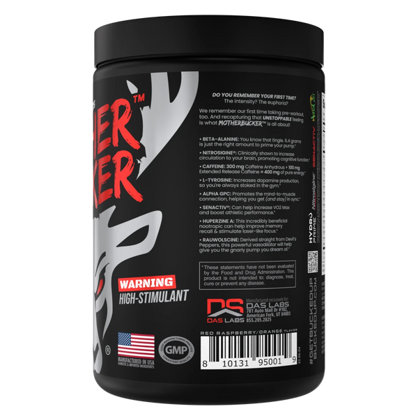 Mother Bucker, from the brand Bucked Up, is positioned as the most intense and powerful pre-workout formula ever created by the company. It is designed to "relive that first-time pre-workout feeling" and is marketed exclusively to advanced athletes and seasoned fitness enthusiasts who have a high tolerance for stimulants.