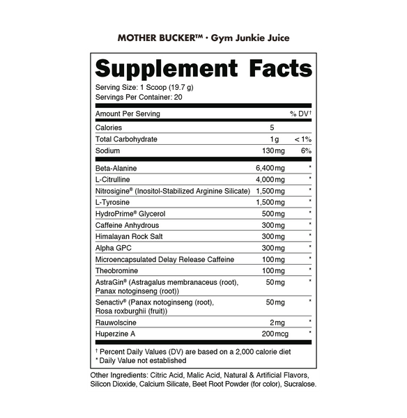 Laser-Sharp Focus and Mind-Muscle Connection: Mother Bucker is a nootropic pre-workout, meaning it's packed with ingredients like L-Tyrosine, Alpha GPC, and Huperzine A. These work together to sharpen mental focus, improve memory, and create a powerful mind-muscle connection, helping you stay "in the zone" throughout your entire workout.