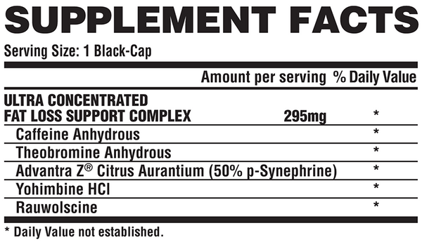 Key Ingredients Per Serving: A proprietary blend including Caffeine Anhydrous, Theobromine Anhydrous, Synephrine HCl, Yohimbine HCl, and Rauwolscine.