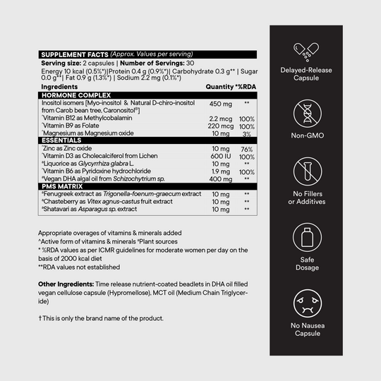 Specialty: PCOS Symptom Management, Hormonal Balance, Slow-Release Technology, Vegetarian, Gluten-Free, Soy-Free, No Artificial Flavors.